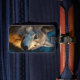 Legal etiqueta de bagagem com um lobo perto do nascer do sol, céu noturno ao fundo. Isso pode ser personalizado com um nome/texto personalizado no lado direito.