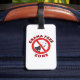Um sinal de trânsito com as palavras: zona livre do drama. Etiquetas de bagagem personalizadas. Texto com imagens das máscaras gregas da comédia e da tragédia. Efeito perturbado aplicado ao design.