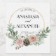 Etiqueta de casamento elegante para vinho. Em um quadro de Natal dourado, coroa dourada com pinhas e rosas em fundo branco.