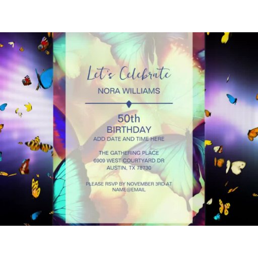 Etiquetas de comida personalizadas para a sua festa de aniversário. Design de aniversário da borboleta. Cores iridescentes. Use a modelo para personalizar o nome, o convidado de honra e os detalhes do evento.