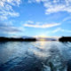 Linda lagoa Oconee Sunset com céu azul, água azul, ondas, nuvens brancas, sol amarelo, roxo