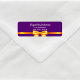 Elegante, clássico, glamoroso e feminino rótulo de endereço de devolução. Uma fita e laço dourados. Um fundo roxo feminino elegante. Modelos para nome e endereço. Letras cor de rosa dourado.