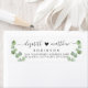 Etiquetas De Endereço De Retorno De Casamento Elegante E Moderno De Aquarela Eucalyptus. Apresentando uma noiva de script bonito escrita à mão e o primeiro nome do noivo modelo com letra de cauda-suástica em preto, pequena forma cardíaca entre os nomes, arranjo de eucalipto de aquarela verde em fundo branco. É fácil personalizá-los com seus nomes e retornar informações de endereço.
