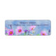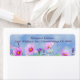 Lindas flores cor-de-rosa e azuis se posicionam contra um céu azul nublado nesta etiqueta colorida de endereço de retorno. Seu texto personalizado está em azul escuro no topo.