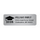 O design moderno de etiqueta de endereço personalizada apresenta um gorro de graduação preto com borla, ano da turma, texto de endereço de devolução e fundo prateado brilhante impresso digitalmente que pode ser personalizado para combinar com qualquer escola ou cores de convite.
