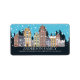 A cidade de inverno dá a etiqueta do endereço de Natal com neve caindo.