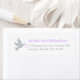 Uma pomba simples e dupla de cinzas com duas fitas roxas com etiqueta de resposta de retorno de casamento para seu convidado para enviar RSVP. Desenvolvido exclusivamente pela Sarah Trett.