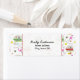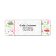 Um rótulo de endereço com um padrão com ilustrações de campânulas, flamingos cor-de-rosa, abelhas e flores.