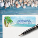 Esta etiqueta de endereço apresenta uma praia tropical com palmeiras. A água é um belo azul e há nuvens espalhadas no céu. Criado por Designs MI