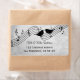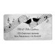 Etiqueta de transporte de casamento com dois pássaros de amor cantando em fios de música. A definição de cor é preto e branco e o fundo tem faíscas de luz e padrões sutis de rendas.