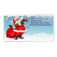 O rótulo do tema Natal Festivo mostra um Papai Noel Jolly com seu saco vermelho e presentes. O céu azul e a neve cobriam o fundo. Personalizar área de texto.