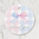 Decorre os favores do seu chá de fraldas com esta etiqueta redonda "Azul ou Rosa?" que revela o gênero, apresentando um padrão clássico de arco de gingham para um toque encantador de acabamento.