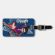 Etiqueta de mala para crianças bonitas, com um menino estrela do foguete com cabelo escuro segurando uma guitarra vermelha em um fundo azul. Ideal para o acampamento escolar, pois você pode adicionar o nome do seu filho e o número de telefone do contato no sentido inverso. Desenvolvido exclusivamente pela Sarah Trett para o meu pequeno eden.