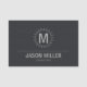 Um design de nome de etiqueta, minimalista e atraente, com uma simples matriz circular em cinza prateada para segurar o seu monograma acima do seu nome de cheio. Foi fornecido um fundo opcional, com aspecto texturado, com um carvão negro, com efeito de linho; elimine esta camada e escolha qualquer fundo de cor sólida, se preferido. Algumas profissões para as quais este cartão seria adequado são: Engenheiro Civil, Avaliador de Custos, Gerente de Projetos, Consultor de Relações Públicas, Fiscal, Conselheiro Financeiro/Assessor, Advogado, Solicitor, Assistente Jurídico, Jurídico, Analista de Computador, Contabilistas, Agentes de Reporte, Agentes Imobiliários, Advogados, Corretores e Profissionais Corporativos. Procure ID313 para ver outras opções de cor para este design.