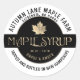 Personalize esta etiqueta de xarope de mapa com o nome comercial, o local, o grau e o volume (lista incluída de conversões nos EUA e métricas para tamanhos populares). Folha de mapeamento de ouro metálico central em círculo negro. Nome do estado no texto curvo próximo à parte inferior do rótulo. Fundo metálico de gradiente de ouro escuro.