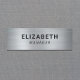 Nome de etiqueta moderno com nome e título em uma simples tipografia contra fundo metálico falso prateado.
