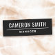 Nome de etiqueta preto com seu nome personalizado e título separado por uma linha branca. Você pode alterar as fontes, as cores de linha e de fundo com a ferramenta design.