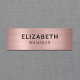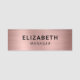 Nome de etiqueta moderno com nome e título em uma simples tipografia contra fundo metálico falso de ouro rosa.
