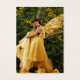 Uma fada querido em amarelo descansa num campo de margaridas florestais.