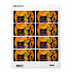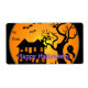 Uma casa assombrada, uma árvore assustadora, fantasmas e morcegos sobre fundo laranja.