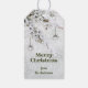 Uma simples etiqueta de presente de Natal elegante, com um galho coberto de neve com ornamentos de estrelas prateadas sobre um fundo cintilante.