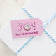Joy se soletrava em doces cor-de-rosa. Aproveite esta etiqueta de presente personalizada e divertida a rosa. É perfeito para uma celebração de feriado única e incomum. Você pode adicionar seu nome ou nome de família em uma fonte fácil de ler.