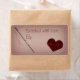 Uma etiqueta de presente de costura personalizável com fundo de tecido, patch cardíaco, pontos e uma agulha.
