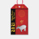 Ilustração de búfalo d'água no estilo história em quadrinhos colocada no padrão tradicional chinês vermelho como fundo + ano ouro do Ox no centro com banda vertical preta para a moderna inscrição amarela : Feliz Ano Novo Chinês e grande 2021 para personalizar se você quiser. Design na etiqueta de presente. Você pode facilmente alterar esses textos (fonte, cor, tamanho e posição) clicando no botão personalizar. Cartão de boas-vindas, cartão postal de férias, convite, artesanatos, suprimentos de festas e muito mais... Perfeito para um divertido Ano Novo Chinês do Ox 2021 ou Aniversário (nascer pessoas no Ox ano).