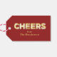 "Cheers" escrito em luzes marqueadas vintage em um fundo vermelho de cranberry faz disso a etiqueta perfeita para uma garrafa de alegria de feriado para amigos, familiares ou parceiros comerciais.