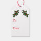Duas ramificações sagradas sentam-se no topo da etiqueta de um lado. Texto "Para:" e "De:" espaçados abaixo para o doador preencher. O segundo lado mostra os ramos verdes e sagrados com bagas vermelhas unidas por toda parte.