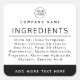 Etiqueta de produto de lista de ingredientes de cor moderna, preto e branco ou personalizada com o seu logótipo personalizado. Altere cores, fontes, mova e redimensione o logotipo e outros elementos com a ferramenta design. Siga-nos no Facebook: @business stationery para mais produtos, notícias, vendas e muito mais.