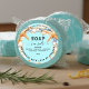 Cor azul-aqua Etiqueta de sabão do mar caseiro com conchas, design de fundo costeiro com letra elegante de caligrafia, espaço para seus ingredientes e outros detalhes. Seu nome de Marca com uma declaração feita com amor por (seu nome).