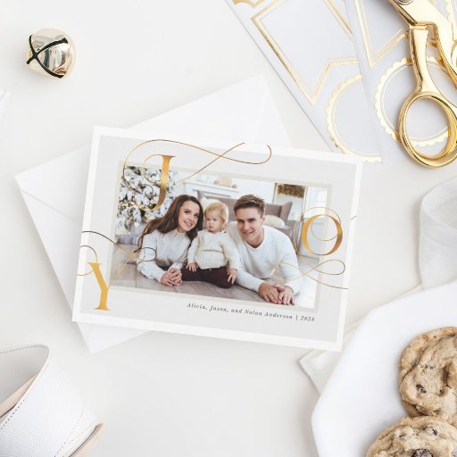 Celebre a temporada com este luxuoso cartão de feriado de "Joy", com um design de tipografia de folha de ouro na moda faux e habilidades elegantes, que enquadram uma foto de família apreciada em uma paleta de marfim, branca e macia. O layout sofisticado destaca a palavra "JOY" em letras graciosas e fluentes, fazer-a uma bela peça central para seus cartões de natal. Parte de uma coleção coesa de feriados, esta design também está disponível em etiquetas de presentes, envelopes e muito mais, permitindo que você crie uma busca coordenada e polida por toda a correspondência de feriados. Perfeito para compartilhar calor festivo e elegância com amigos e familiares.