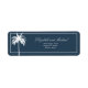 Uma etiqueta de endereço de retorno pessoal elegante da Palm Tree azul e branca. Uma palmeira elegante está sobre os nomes. A informação é facilmente alterada para a sua. O script moderno é facilmente alterado para suas próprias informações personalizadas. O rótulo personalizado está sozinho, mas faz parte de um papel de carta de casamento nas Designs Finas de Chessie.