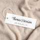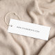 Vestuário personalizado elegante, acessórios, joias, boutique, etc., etiqueta branca com seu nome ou marca mostrada em um script de assinatura de na moda. Acrescentar texto adicional por baixo e por trás, em caracteres simples e modernos.