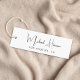 Vestuário personalizado chic, acessórios, joias, boutique, etc., etiqueta branca com seu nome ou marca mostrada em um script de assinatura de na moda. Adicione texto adicional abaixo e no verso em caracteres simples e limpos.