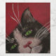 Um gato de smoking branco e preto, com olhos verdes brilhantes, se senta sobre um fundo vermelho muito rico nesta pintura, fez uma etiqueta de vinho. Porque o que vai melhor que gatos e vinho.