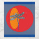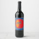 Desenho bonito e detalhado de uma libélula azul solteiro num grande círculo vermelho com um dentro oval laranja faz uma etiqueta de vinho ousada e única.