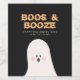 "BOOS & BOOZED" Etiqueta de vinho de Halloween apresentando um fantasma branco de desenho animado com fundo preto e texto branco e laranja. Minimalista, moderno e divertido. Todo texto é personalizável, personalize com breve saudação, ano e nome. Excelente para a festa temática do Halloween ou presente de Halloween para adultos.