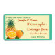 Trio de laranjas, uma fatiada aberta com um abacaxi atrás delas, é enfiada no canto inferior esquerdo deste rótulo com um fundo de amarelo pálido, rodeado por uma borda e fundo de verde-turquesa moderado, o que torna este rótulo perfeito para usar nos seus potes de doce ou conserva de laranja de abacaxi caseiro. O texto está na forma de modelo para que você possa mudá-lo para o que quiser.