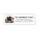 Dê as boas-vindas aos convidados para uma festa anual de fantasias de Halloween, chá de bebê de Halloween, ou qualquer evento com este rótulo de endereço de retorno divertido e simples. Uma aparência simples geral preta e branca que tem uma mistura de tipografia simples e cursiva. Uma casa assombrada preta com explosões de cor laranja de árvores laranja, abóboras e jack-lanterns. Alguns fantasmas e morcegos fofinhos apenas complementam essa aparência divertida. Etiqueta de endereço de retorno de festa de fantasia de Halloween de casa assombrada com fantasmas e morcegos em aquarela fofa.
