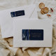 A borda esquerda desta elegante e moderna etiqueta de endereço de retorno de convite de casamento apresenta uma marinho azul de aquarela agata borda aparada com falso brilho dourado. O texto personalizável combina fontes de manuscrito douradas e de impressão em um fundo azul marinho.