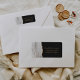 A borda esquerda desta elegante e moderna etiqueta de endereço de retorno de convite de casamento apresenta uma cinza e uma borda branca com uma falso brilho dourado. O texto personalizável combina letras douradas e fontes de impressão impressas em um plano de fundo off-black.