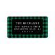 As etiquetas de endereço de retorno de feriado contêm texto personalizado branco que pode ser personalizado com um fundo padrão de verificação de xadrez verde e preto.