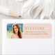 Design de etiqueta de endereço personalizada simples e elegante apresenta uma fotografia de mais velho do formando com texto antigo de endereço de retorno dourado e fundo cor-de-rosa pincel. As cores podem ser personalizadas.