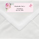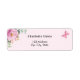Fundo rosa claro. Uma rosa rosa, folhagem floral e de eucalipto, folhagem em dourado falso e uma borboleta. Personalize e adicione seu nome e endereço. Letras pretas.
