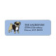 Esta etiqueta de endereço de retorno divertida mostra uma imagem fofa de um cãozinho marrom vestindo uma jaqueta de smoking. A imagem é colocada sobre um fundo azul de cinza. Seu texto está preto à direita da imagem. *Crédito de Design para a imagem a Winchester Lambourne em etsy.com.