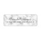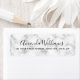 Etiquetas de endereço clássicas e elegantes com seu nome em uma fonte elegante de script de caligrafia e o endereço abaixo em uma textura de mármore branco com veias mais escuras.