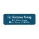 Rótulo de nome e endereço de retorno azul e branco com o nome da sua família em uma fonte de script acima dos detalhes do seu endereço.