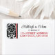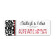 Essas etiquetas de endereço de retorno de casamento de cor damasco branca e preta têm uma cor damasco no lado esquerdo com a área de texto em branco que corresponde ao convite de casamento definido abaixo. O(s) seu(s) nome(s) e endereço(s) de devolução estão em letras negras e vermelhas com um divisor de rolagem preto ornamentado entre eles.